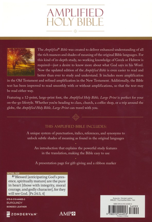 This updated, large print edition of the Amplified Bible includes more amplification in the Old Testament and refined amplification in the New Testament. Additionally, the Bible text has been improved to read smoothly with or without amplifications, so that the text may be read either way. It’s the same feel and style of study material that you love, now with even clearer wording for deeper understanding.