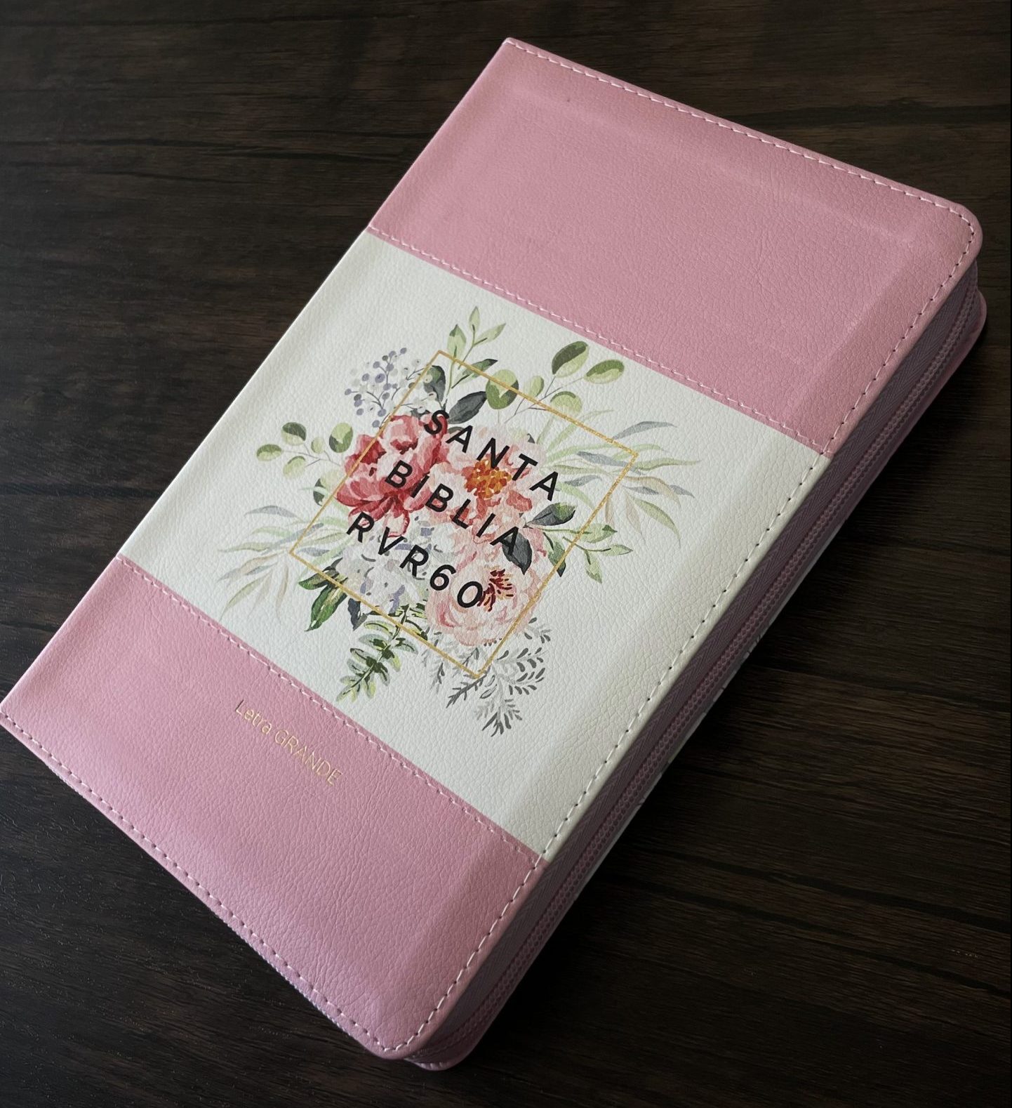 Biblia Reina Valera 1960 Tamaño Manual Letra Grande 12 puntos- Imitación Piel Rosa/Flores Con Cierre y Con índice