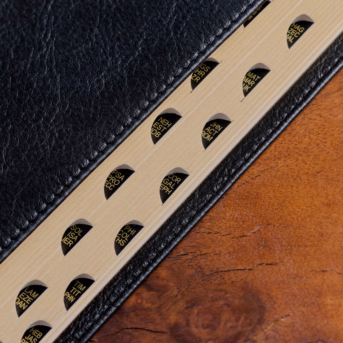 The cover is crafted from supple black full grain leather that is reinforced with topstitching around the edges and rounded corners. Elegantly gilt-edged pages and a satin ribbon marker lend a sense of sophistication to the Bible. The title is gold foiled and appears on the spine.