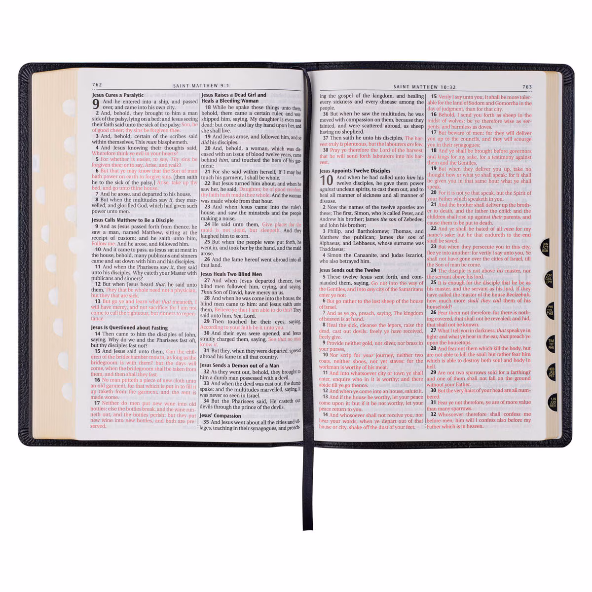 This Black Full Grain Leather Large Print Thinline King James Version Bible with Thumb Index is an excellent choice for people who value both convenience and comfort when choosing a Bible. This flexcover KJV Bible combines the portability of a thinline Bible with the benefits of a magnified type size. Just slip this slim, easy-to-read Bible into a backpack, briefcase, or purse and enjoy accessibility to it throughout your day.