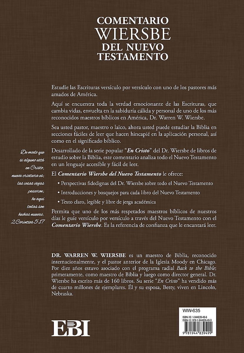El Comentario Bíblico Wiersbe del Nuevo Testamento le ofrece: El discernimiento confiable del Dr. Wiersbe que se ve en todo el Nuevo Testamento incluye introducciones y contornos para cada libro del Nuevo Testamento con texto claro y comprensible que está libre de jerga académica. Que uno de los maestros bíblicos más amados y respetados de nuestro tiempo le guíe versículo por versículo a través de las Escrituras. Es la referencia de confianza que le encantará leer.