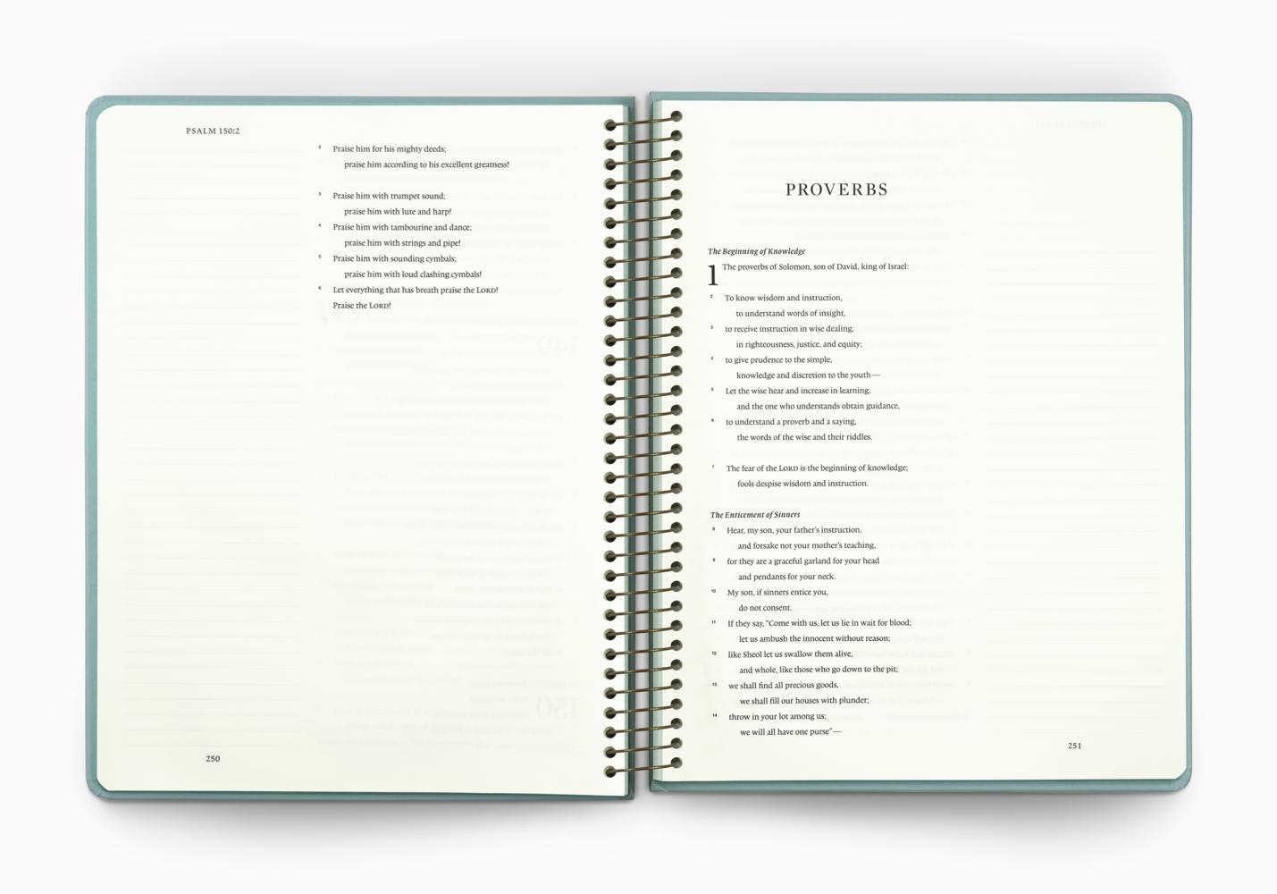 The ESV Spiral-Bound Journaling Bible, Poetry was created from the ground up to facilitate in-depth note-taking. It includes the 5 Poetical Books of the Old Testament—Job, Psalms, Proverbs, Ecclesiastes, and the Song of Solomon—in an inviting, easy-to-read layout with generous space for notes. The spiral-bound format lies flat for comfortable reading and writing. Designed to encourage deeper interaction with Scripture, this journaling edition is ideal for recording prayers and reflections.