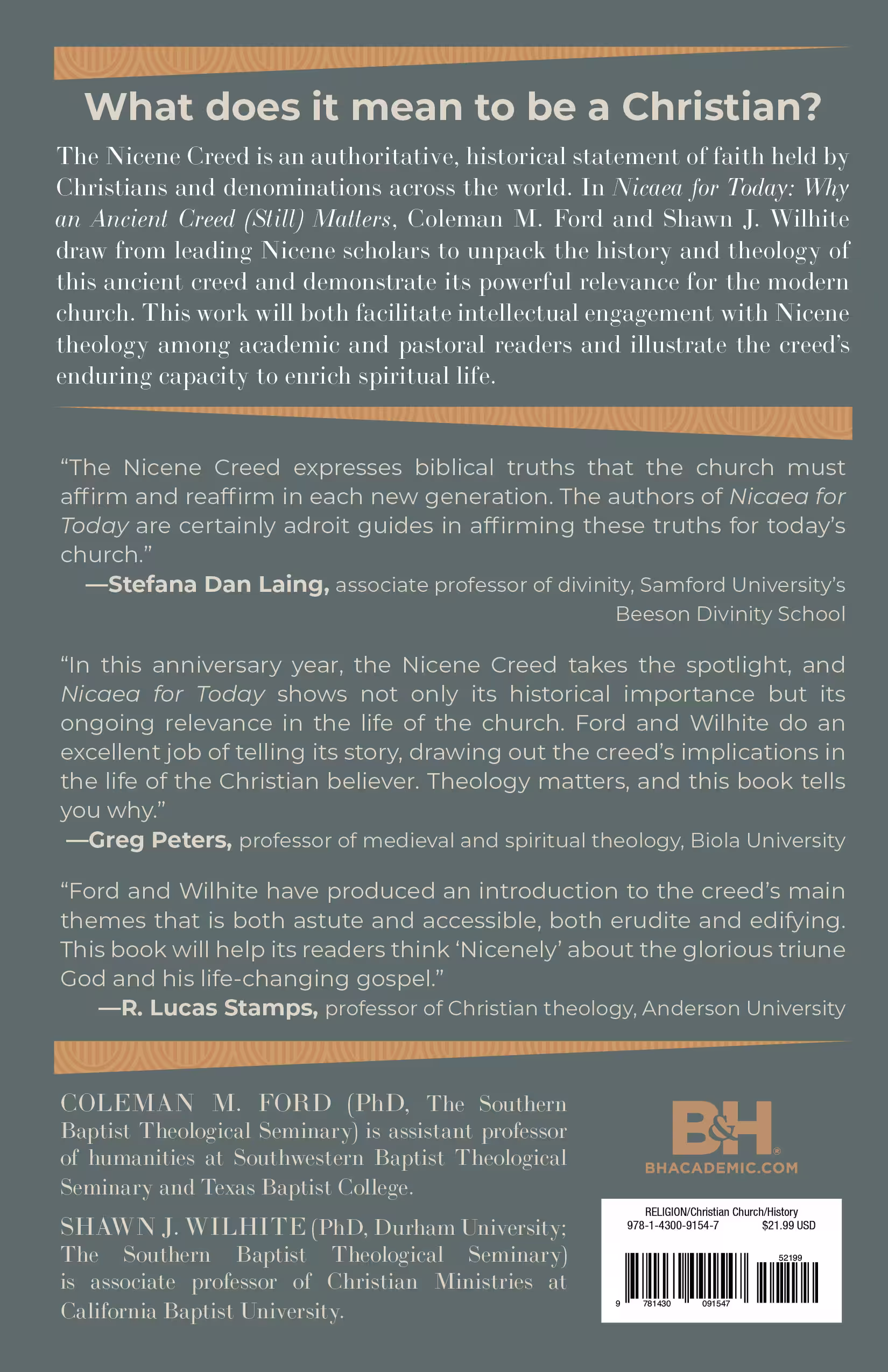 In Nicaea for Today: Why an Ancient Creed (Still) Matters, Coleman M. Ford and Shawn J. Wilhite draw on insights from leading Nicaea scholars to unpack the history and theology of this ancient creed in accessible language while demonstrating its powerful relevance for the modern church. The primary objective of this work is to facilitate intellectual engagement with Nicene theology among academic and pastoral readership and the creed’s enduring capacity to enrich spiritual life in the contemporary context.